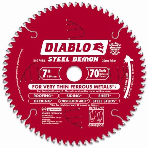 Freud's Diablo Steel Demon saw blades continue to meet the growing demands of contractors, steel building erectors, HVAC installers, and other steel fabricators. Steel Demon blades include tools with metric arbors for popular low RPM dedicatated metal cutting saws as well as new blade designs for conventional 7-1/4-Inch circular saws. Steel Demon saw blades are specially designed for the extreme demands of ferrous metal cutting; thereby enabling precise cuts without sparks, heat or burred edges that result from using abrasive blades. With up to 40X the life of standard abrasive disc, Steel demon delivers unparalleled performance and superior quality cuts. Blades feature Freud's TiCo Hi-Density Carbide, Laser cut bodies, Anti-vibration technology, Perma-Shield Non-Stick Coating, Triple Chip Design, and Pretensioned blades. This blade is designed to fit Evolution , Jancy , Morse , and Similar Metal Cutting Saws. 7-Inch/180mm diameter x 70t, 20mm arbor, 3900+ RPM, 18 ga or thinner max cut thickness, general purpose steel.